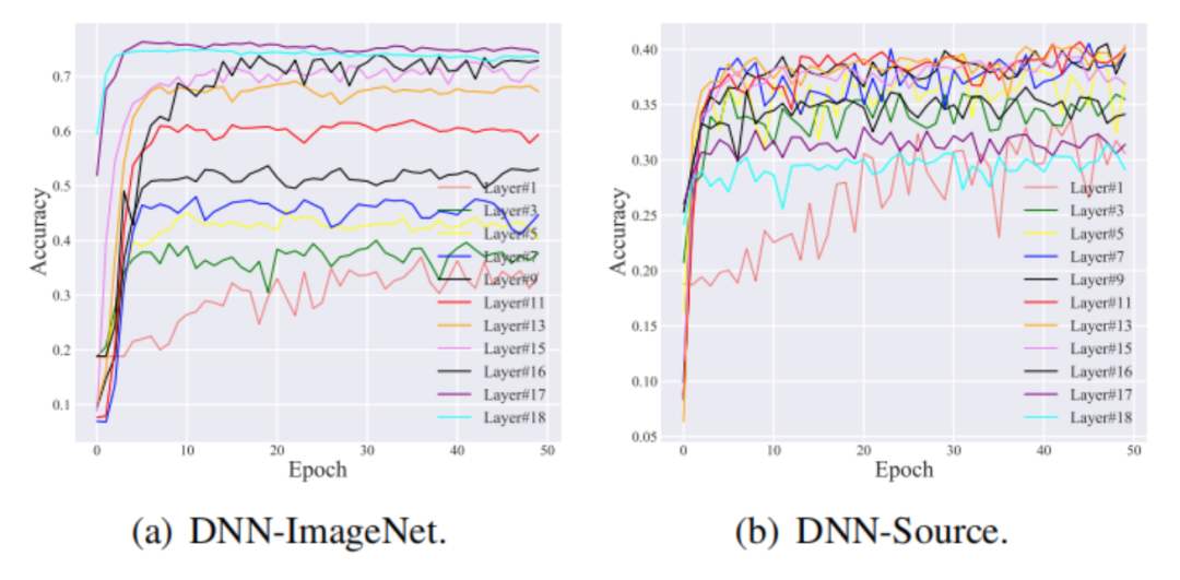 上图是层迁移实验中的训练曲线,可以看到,由DEPARA挑选出来的层,迁移效果要好于其他层。而且,相比于DNN-Source,DNN-ImageNet中的训练曲线明显更加地平滑,这也恰恰证明了迁移性越好的模型,在迁移时所花费的重训练的成本就越低,也越容易地迁移至目标任务。