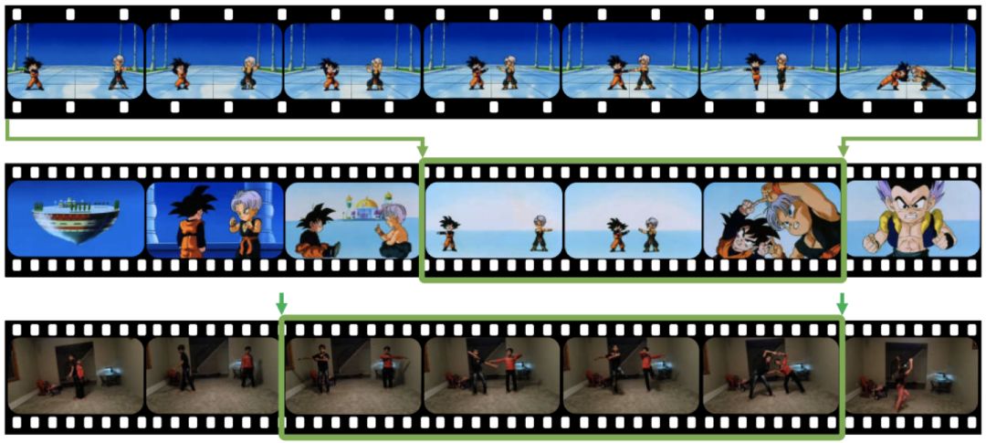 ▲ 图1:一段查询视频(上)和两段备选视频(中、下)。与查询视频相关的片段已经用绿色方框标出。