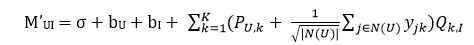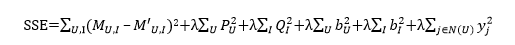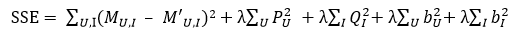 同时,误差E除了由于M‘计算方式带来的变化之外,也同样需要加入U和I偏置的正则项,因此最终的误差函数变成了
