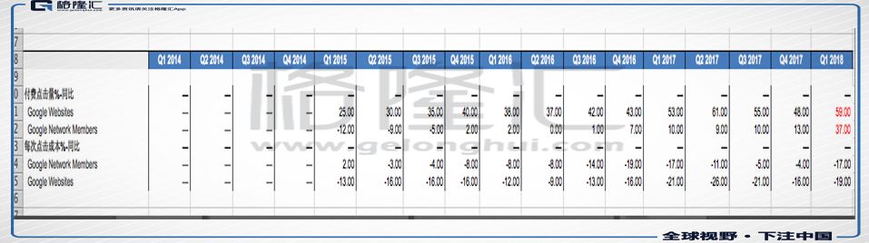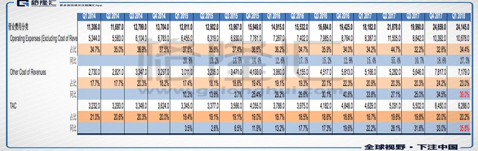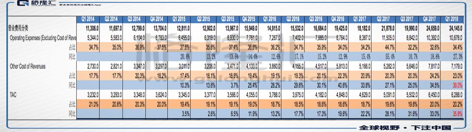 2018年Q1谷歌的流量获取成本是63亿美金,2017年Q1这个数字是46.3亿美金,同比上升36%左右。