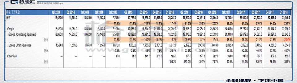 谷歌Q1收入311.46亿美金,同比增长25.6%,增速是过去4年里最快的一个Q,其中谷歌广告收入同比增长24.4%,也是过去4年里增速最快的一个季度。