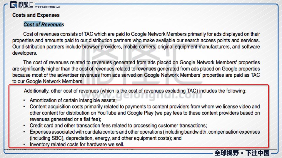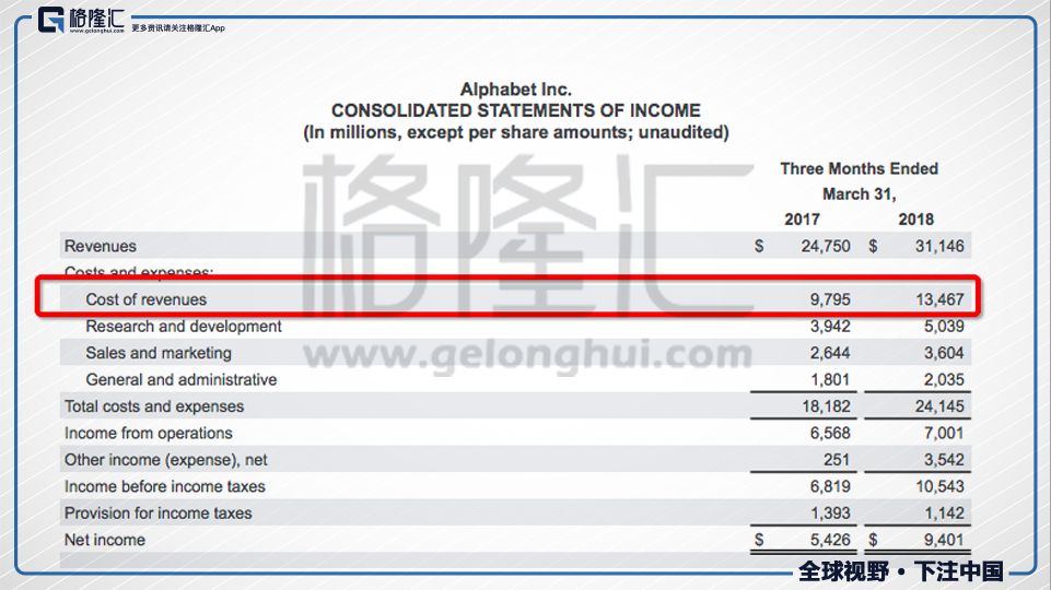 谷歌的财报非常简单,利润表一般12行就全部搞定。单看利润表是找不到一个other cost of revenue的。
