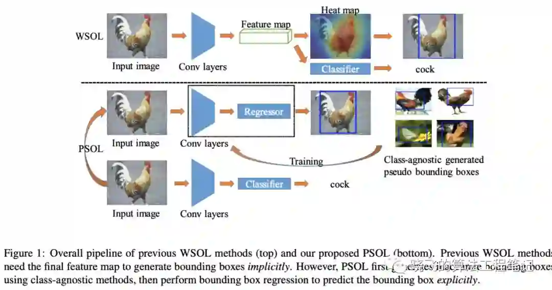 PSOL与WSOL的区别在于给无标签的训练图片产生伪bbox,Detection是最好的选择,能够直接提供bbox和类别。但是最大的检测训练集才80类,不能提供通用的目标检测,而且目前的detector大都需要大量的计算资源和输入尺寸,导致不能在大规模数据集上使用。除了detection模型,可以尝试定位方法来直接产生训练图上的bbox
