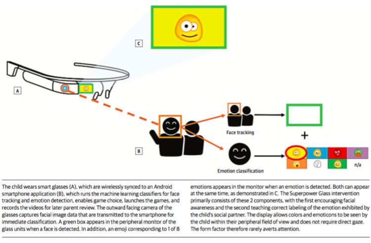 项目配合谷歌眼镜开发的软件名为“Superpower Glass”,它不是用于所有社交场合,而是用作家庭培训工具。为此,随附的手机应用程序可让用户将表情符号与父母或看护人的情绪相匹配,另外还可以帮助促进眼神接触,最终提高自闭儿童与他人互动的能力。