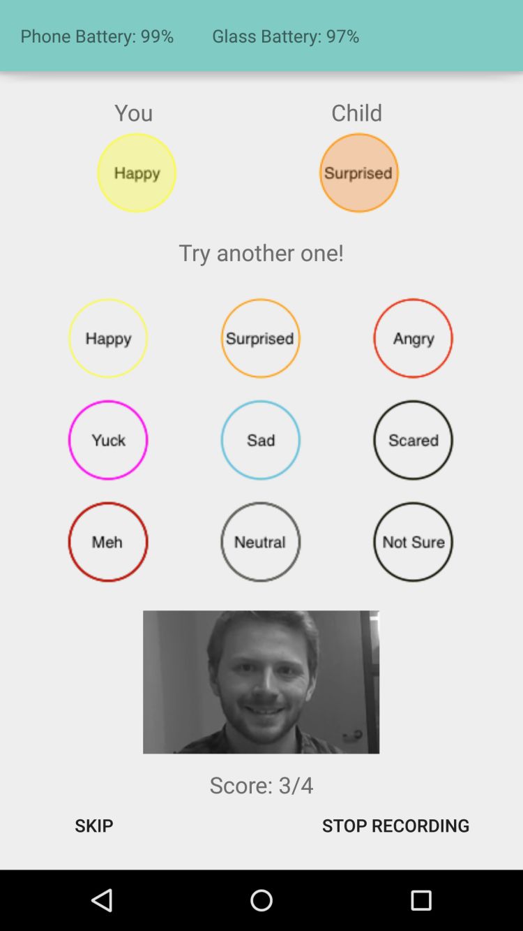 实验中,Google Glass的计算机视觉系统,无线连接到智能手机应用程序,为佩戴设备的孩子提供干预。该系统以答曰每秒15-20真的速率运行,通常100毫秒内就可识别出面部表情。