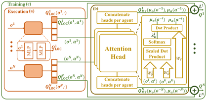 其中,Q_LOC^i 为基于局部信息的个体 i 的动作值函数,用于动作选择;Q_MF^i 为基于近邻信息的平均场影响函数,用于辅助对 Q_LOC^i 的估计。考虑到智能体不同近邻的重要性不同,所以研究员们使用注意力机制(Attention)建立了单体与近邻的权重 λ^i (o^i,o^k,a^i,a^k),并基于此计算带有重要性权重的近邻观测分布 μ_o (o^(-i) ) 和动作分布 μ_a (a^(-i) ) ,以构建平均场影响函数 Q_MF^i。