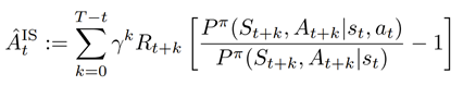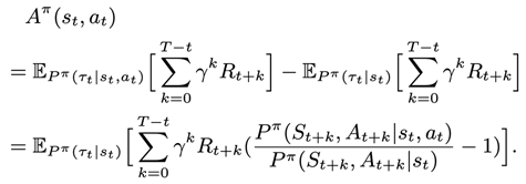 上述例子表明,如果执行当前的动作不影响未来某些状态的概率,那么这些未来状态上的奖励在估计优势函数时就可以被忽略。研究员们对上述观察进行了概括和抽象,并提出了基于重要性采样的优势函数估计量。下面给出的是基于重要性采样推导出来的该估计量的形式: