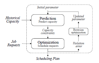 在云计算中,由于需求的庞大和多样性,平台计算资源的容量管理一直是一个极大的挑战。为了更好地根据整个云计算平台的容量进行规划,平台往往会提前收集一部分非即时的计算作业需求,这些计算作业可以持续运行指定长度的时间,且起止时间更加灵活。通过根据非即时计算作业的需求和平台在未来一段时间内的容量情况来进行统一调度,有助于平衡整个平台的工作负荷,提升平台资源的利用效率。但是,由于平台上未来可用的计算容量是不确定的,所以对这些非即时作业的调度,在不确定的计算资源约束下进行安排是一个巨大的挑战。