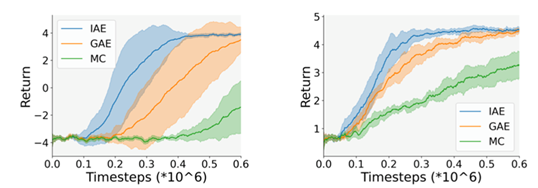 在该方法中,存在于环境中的独立性可以用来构建一个基于重要性采样 (importance sampling) 的优势函数估计量。该估计量可以忽略未来无关的部分奖励,从而减小估计中的方差。为了进一步减少优势函数估计的方差,研究员们把该估计量和已有的蒙特卡洛估计量进行融合,并将最终的优势函数估计量命名为 IAE (Independence-aware Advantage Estimation)。实验结果表明,在策略优化算法中,IAE 与现有的优势函数估计方法 (GAE, MC) 相比,达到了更高的样本利用率。