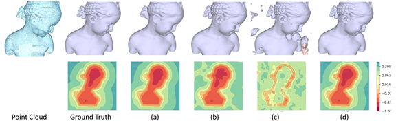 在使用 MLP 从点云中重建 SDF 的任务中,微软研究院的研究人员发现,如果直接将 3D 坐标作为 MLP 的输入,那么输出的形状会被过度平滑,丢失高频细节(见图6-(a))。为了解决这一问题,研究员们提出将三维坐标通过一系列正弦/余弦函数映射到高维空间,即 Fourier Positional Encodings(见图6-(b)),然后再作为 MLP 的输入;或者将 MLP 中常用的 ReLU 激活函数替换为正弦函数(见图6-(c))。这些方法虽然能够拟合三维形状的几何细节,但是输出的 SDF 非常杂乱,其低频量无法被很好地重建。因此,微软研究院的研究员们提出了基于样条的位置编码,即 Spline Positional Encodings。该方法不仅可以重建三维形状的高频细节,还能够输出高质量的 SDF(见图6-(d))。