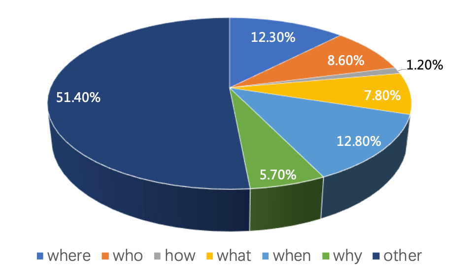 最后我们得到了整个CMRC 2018数据集,其综合统计数据以及开发集中的问题分布如下所示。