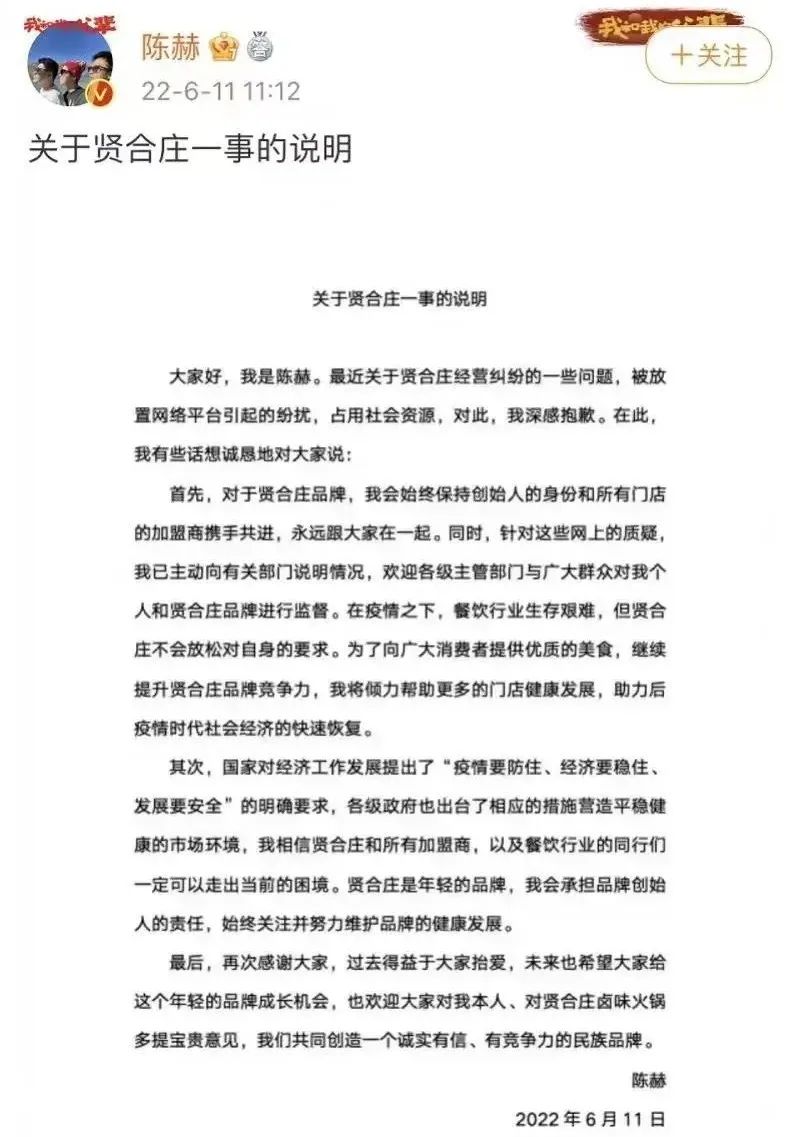 6月8日,贤合庄在微博发布声明,针对近日“陈赫退出福建贤合庄股东”“陈赫收取2.4亿加盟费”等相关内容作出回应。并称,2020年初疫情爆发以来,贤合庄全国门店经营压力显现,公司多次采用物料及费用补贴等措施,与全国门店共度难关。
