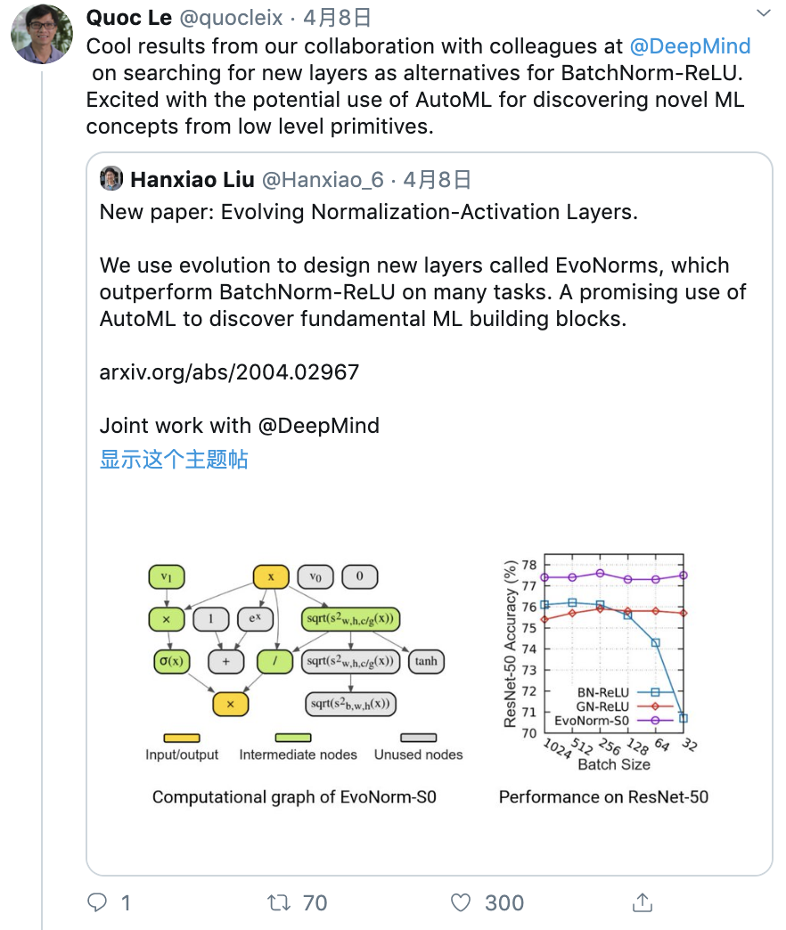 最近,谷歌大脑团队和 DeepMind 合作发布了一篇论文,利用 AutoML 技术实现了归一化激活层的进化,找出了 BatchNorm-ReLU 的替代方案 EvoNorms,在 ImageNet 上获得 77.8% 的准确率,超越 BN-ReLU(76.1%)。