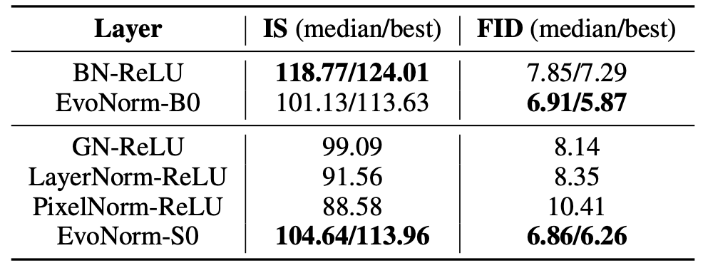 表 5:BigGAN-deep 生成器中不同归一化激活层的图像合成性能,其中使用批统计量与不使用批统计量的层是彼此分离的。如图所示,中位数和最佳性能是在 3 个随机种子上取得的。IS 值越高越好,FID 值越低越好。