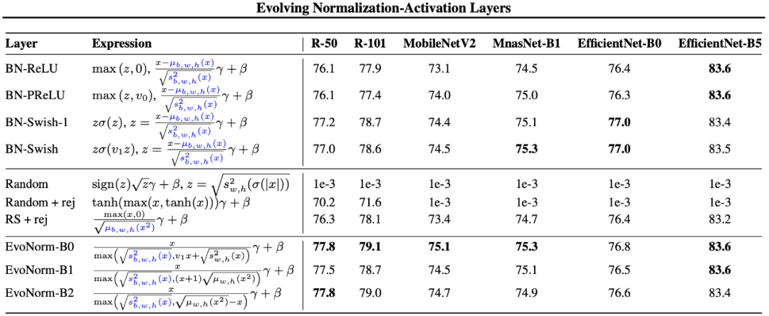 在表 2 中,研究者将所发现的层与应用广泛的归一化激活层在 ImageNet 数据集上进行比较,包括使用谷歌之前提出的 Swish 激活函数的强基线。