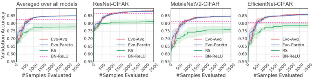 图 10:在代理任务中,进化 vs 随机搜索 vs 固定基线(BN-ReLU)的搜索进程。