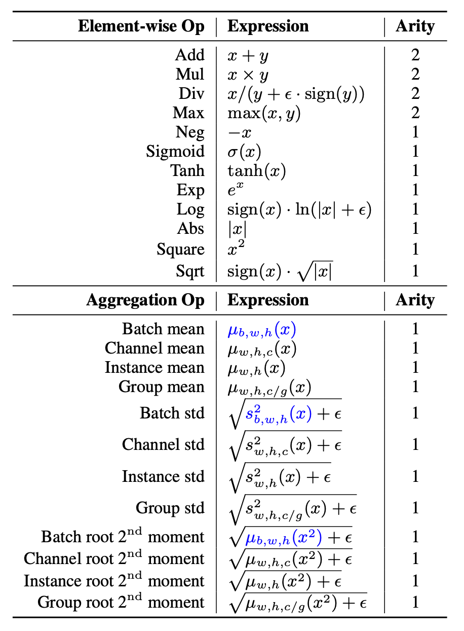 研究者将每个归一化-激活层表示为一个计算图,即将输入张量转换为同样形状的输出张量(见图 1)。每个中间节点表示一元或二元运算(见表 1)。这些运算旨在保存输入张量的维度,以确保计算图中节点的形状彼此兼容。计算图共有 4 个初始节点:输入张量、常数零张量,以及沿着被初始化为 0 和 1 的通道维度的两个可训练向量 v_0 和 v_1。