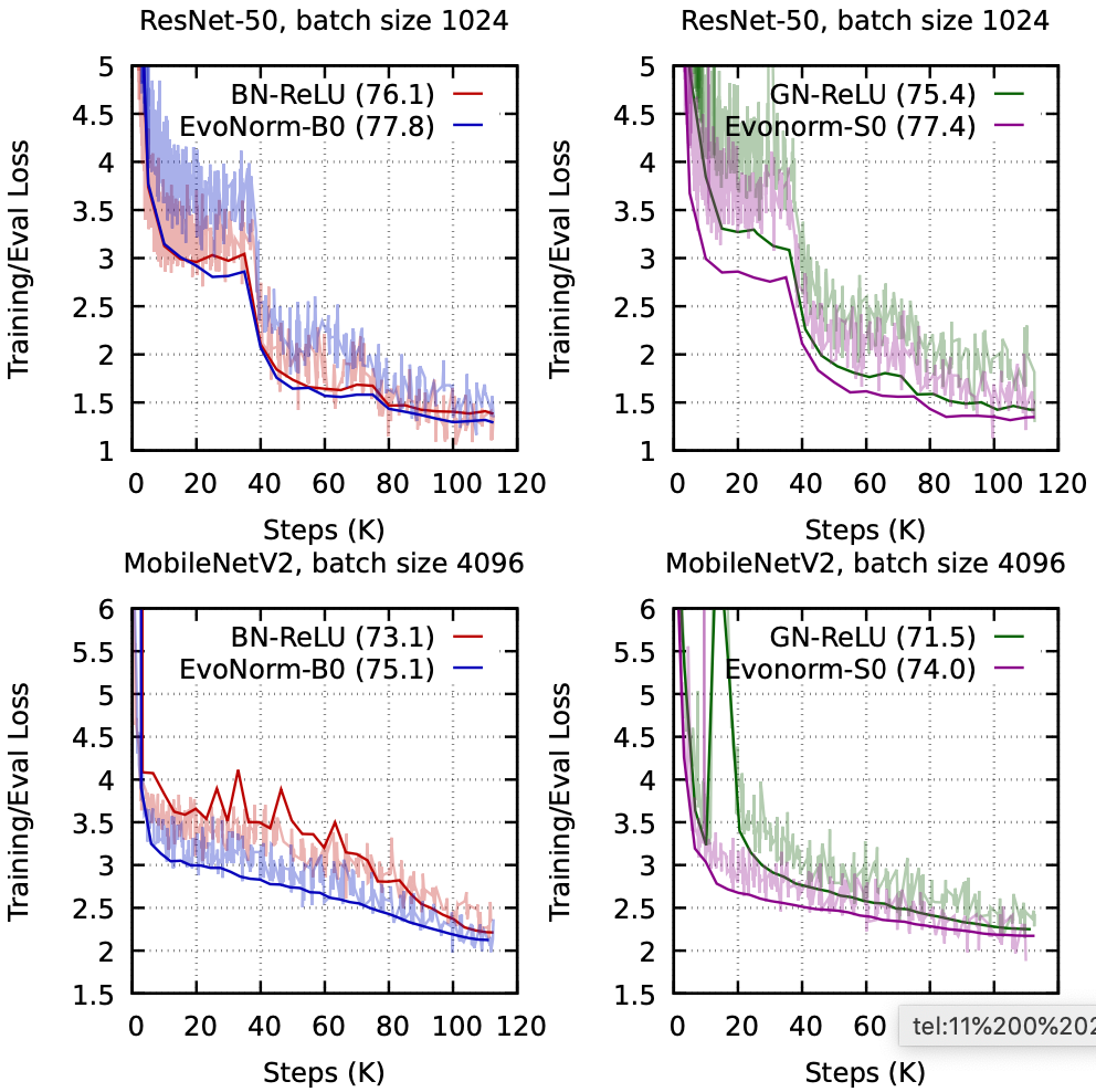 图 7 展示了具备大批量的 Evonorms 的学习动态。在相同的训练环境下,尽管训练损失较大,但在 ResNet-50 上 EvoNorm-B0 的性能仍然优于 BN-ReLU。