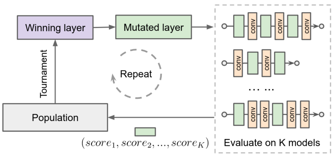 图 3:层搜索算法的工作流程。将每个产生突变的层与 K 个架构配对,从头开始训练以得到 K 个多目标锦标赛选择算法的性能分数。