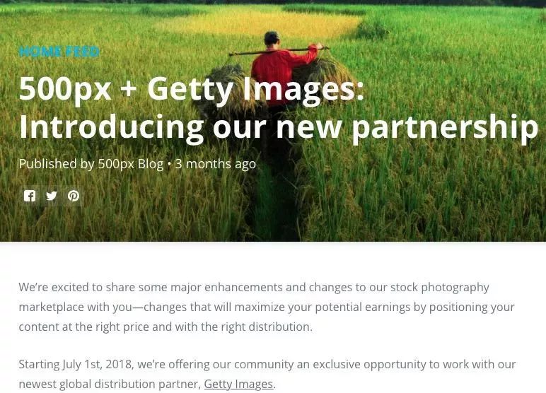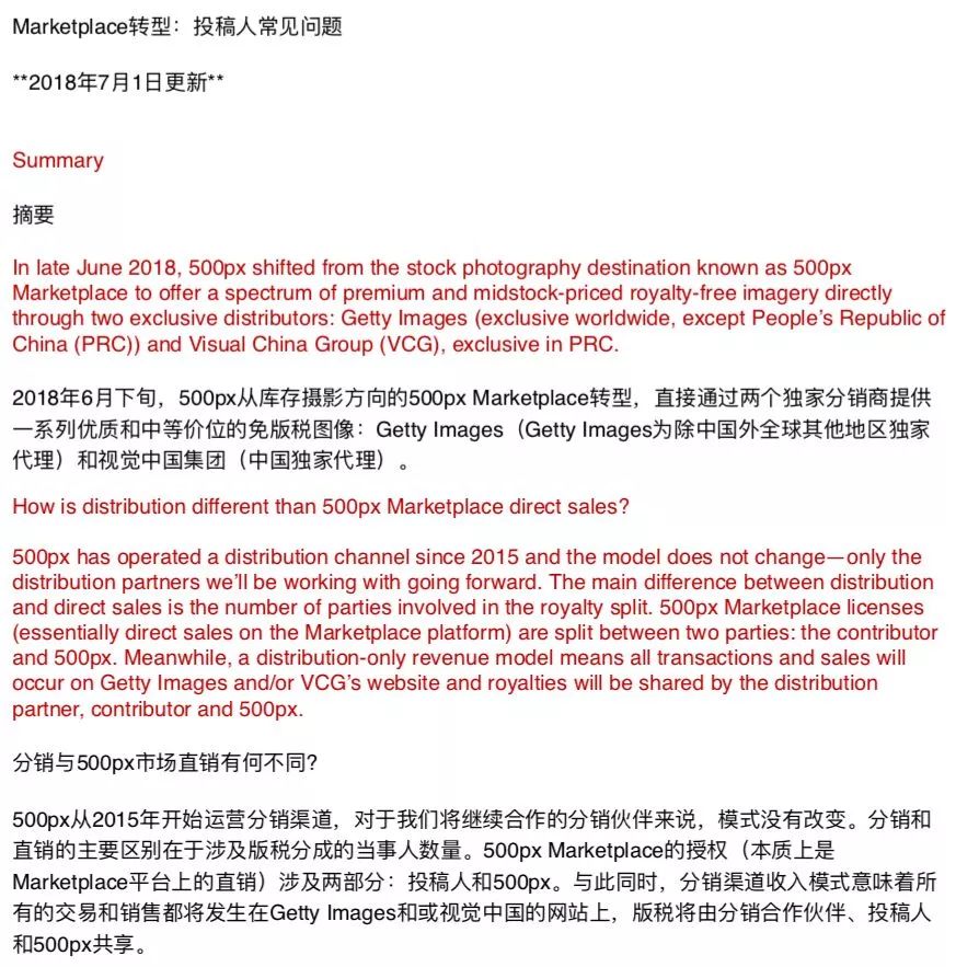 收购后不到半年,当用户再登陆500px时会看到这样的提示:“500px的Marketplace(500px的直接销售平台)已经关停,现在500px的图片只能在Getty和视觉中国购买。”实际上,从2018年7月1日起,视觉中国负责500px在中国的业务,而500px的国际销售业务则全权交由Getty代理。又是Getty!