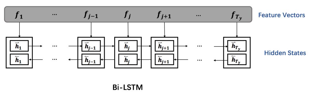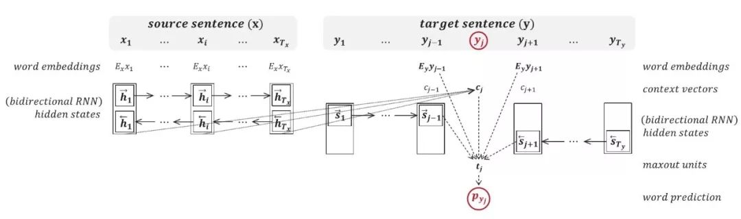 如下对于原语句子 x,模型首先将每一个词都表征为词嵌入向量,然后再馈送到正向和反向两条 LSTM,每一个时间步需要同时结合正向和反向 LSTM 的隐藏状态并作为最终的输出。对于目标语句子 y,在第 j 个词之前的序列使用正向 LSTM 建模,而第 j 个词之后的序列使用反向的 LSTM 建模。最后在预测第 j 个词时,需要使用原语句子 x 的上下文向量 c_j(由注意力机制得出)、目标语前一个词及前面序列的语义信息、目标语后一个词及后面序列的语义信息。