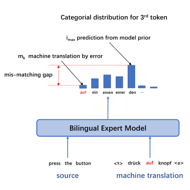 总体而言,在阿里的模型中,利用预先训练的专家模型,先抽取基于模型隐层的一些 high level 表示信息,以及该词的前后词的词向量,最后再通过一个全连接层做一次线性变换。除此之外,阿里还构造了 mis-matching features。如下图所示,当某个翻译结果错误单词不多的时候,预训练模型会给出正确的单词预测分布,这和翻译结果激活的单词会存在一个 gap。这个 gap 是一个非常重要的特征,阿里机器翻译团队的实验显示就算只用这个特征去做下一步预测,也可以得到很好的结果。详细内容可以参考阿里机器翻译团队的论文:“Bilingual Expert” Can Find Translation Errors [1]。