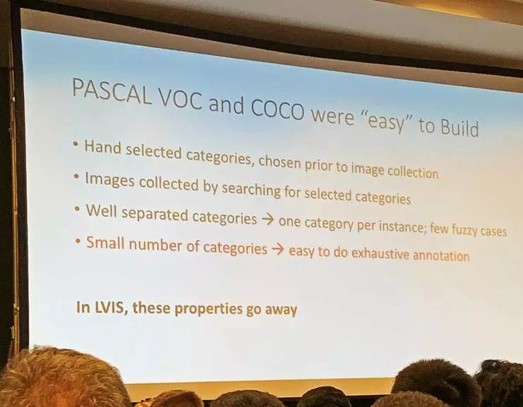 Ross 说道,构建数据集时就需要重新思考不少东西:过往的数据集构建时,做法都是先选定想要包含的类型(哪一千个类别),再通过关键词搜索对应类别的图片,然后添加到数据集中。这样的结果就是模糊的类别少、类别总数目有限、不同类型的样本分布过于平衡。这其实都是和更广泛的图像、生活中的图像的特性不符的,也达不到检测所有物体的目标。LVIS 的设计目标和方法都有所不同,所以不再有这些特点(也可以说是缺点)。