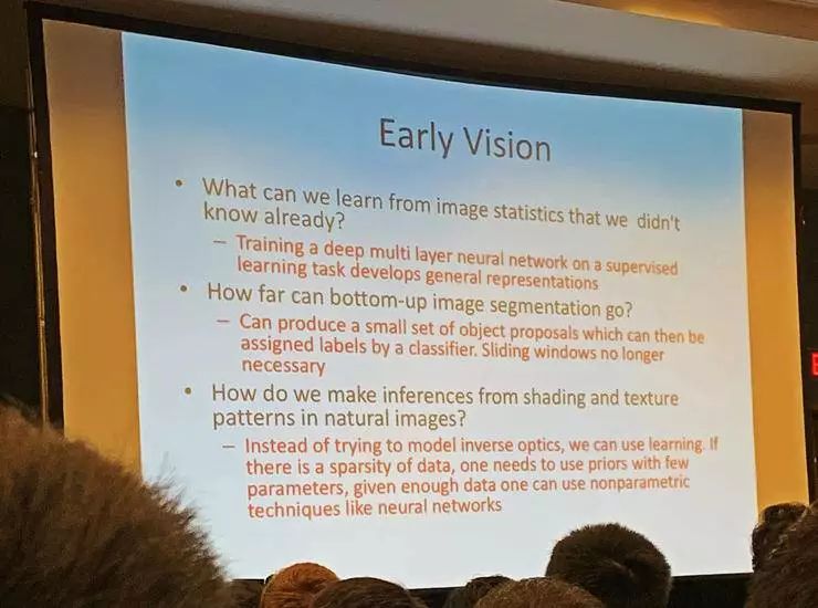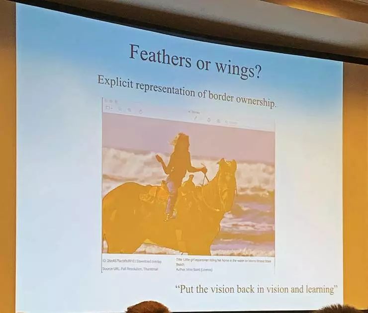 接下来 Bill Freeman 花时间和听众一起讨论了许多视觉系统概念的辨析,大家交换了一下看法。鸟类能够飞行,当时有人认为是因为鸟有羽毛,也有人认为是鸟有翅膀。现在当然公认翅膀才是对飞行来说真正重要的,羽毛不一定需要。他希望大家思考一下,后面的这些概念,对视觉系统来讲哪些是翅膀、哪些是羽毛。也藉由这些讨论,窥探未来计算机视觉研究有待探究的课题。