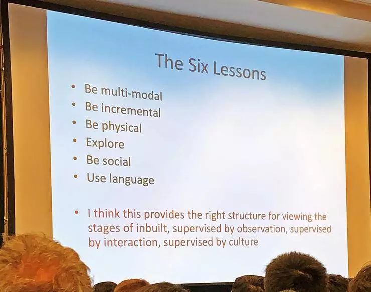 这六个方向是:多模态学习;渐进学习;物理交互学习;探索;社交学习;使用语言。对于体现不同阶段的内建过程(以观察为监督、以互动为监督、以文化为监督),他认为这是挺合适的思考结构。
