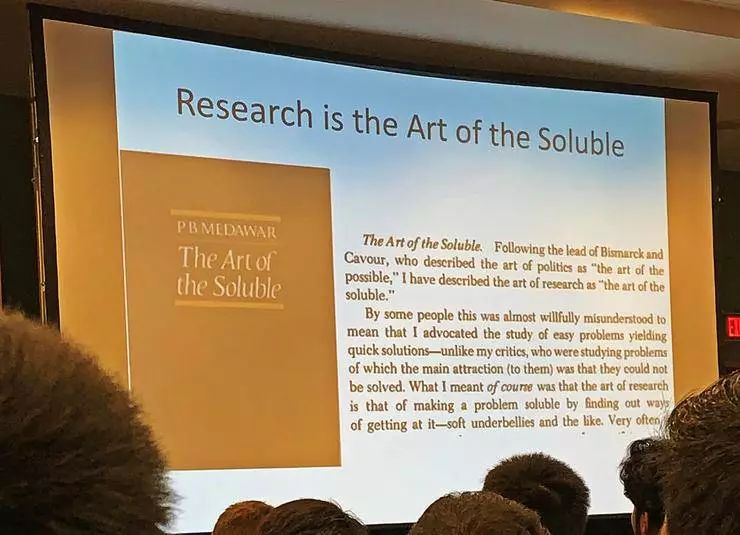 Malik 开场首先说了像绕口令一样的一句话:科研的艺术,就是要找重要的、未解决的、但能解决的问题,去解决。