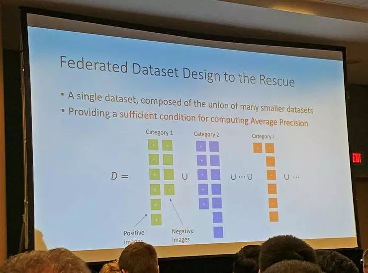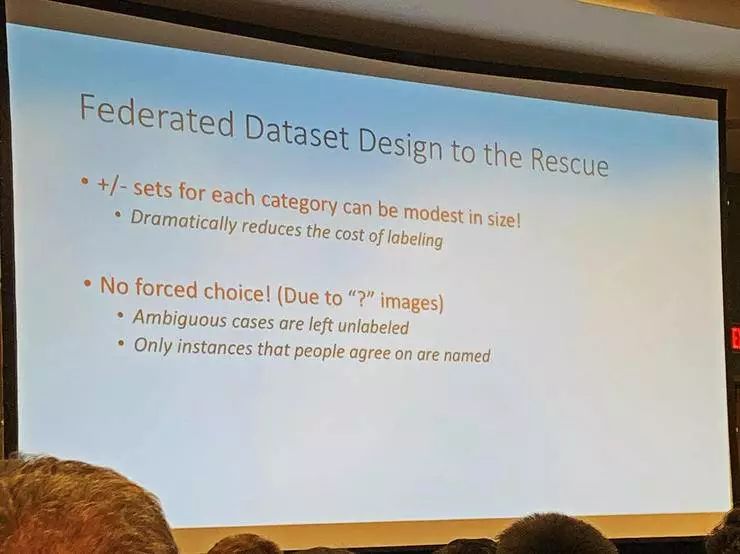 Facebook 的解决方案是用联邦数据集的概念,不做所有图像中的实例的精细标注,而是把整个数据集看作许多个类别数据集的集合;其中每个类别数据集由出一定数量的正例和负例组成,除此之外的图像都允许处于未知的状态,不再逼迫分类器一定要给出某个结果。
