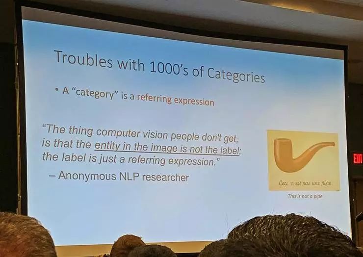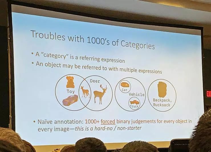 Ross 着重说了一下他们对「类别」概念的重新思考。目前的对象识别数据集中都有许许多多类别名,但是「类别名只是一种表达」,并不能真的等同于类别本身的定义。