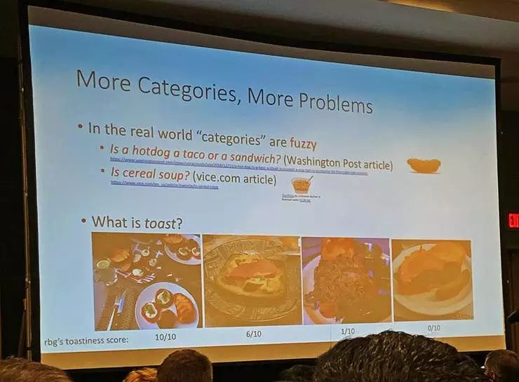 除此之外,真实世界的物体分类很多时候也就是模糊的,比如 hotdog(热狗)、taco(肉卷)、sandwich(三明治)三者之间的区别就很难说清,cereal(燕麦粥)和 soup(粥)也很类似。对于 toast 的理解就更是令人迷惑了。没有准确的定义,类别间的区别非常模糊。这都说明了没法做以往那样的直白的标注。