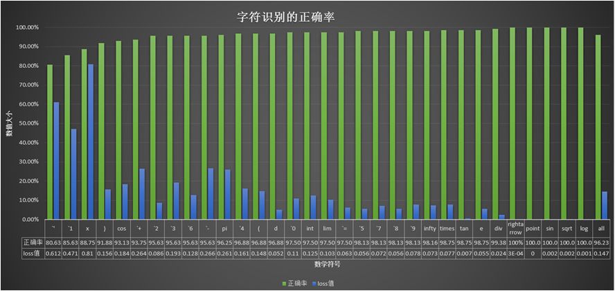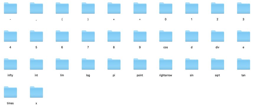 训练网络选用的数据集是国际数学公式识别比赛数据集(CROHME)。CROHME 数据集具有海量字符集图片,而且图片类型与实际输入非常相似。每种字符有 400 张图片,其中 60% 的图片用于训练,40% 的图片用于测试。
