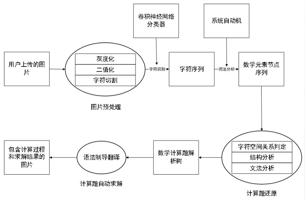 整个程序使用 Python 实现,具体处理流程包括了图像预处理、字符识别、数学公式识别、数学公式语义理解、结果输出。