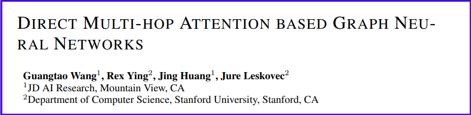 因此提出 Direct multi-hop Attention based Graph neural Network (DAGN),在注意力机制中加入多跳信息,从邻居节点扩展到非邻居节点,增加每一层网络中的感受野(receptive field).下面介绍的该文章的作者单位包括京东AI Research和斯坦福大学,通讯作者是图学习巨佬 Jure Leskovec,于2020年10月2号放在arXiv上.
