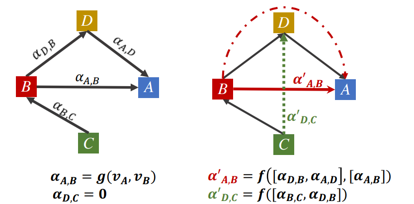 Attention diffusion是每一层中用于计算DAGN‘s的attention分数。首先计算每一条边上的attention分数