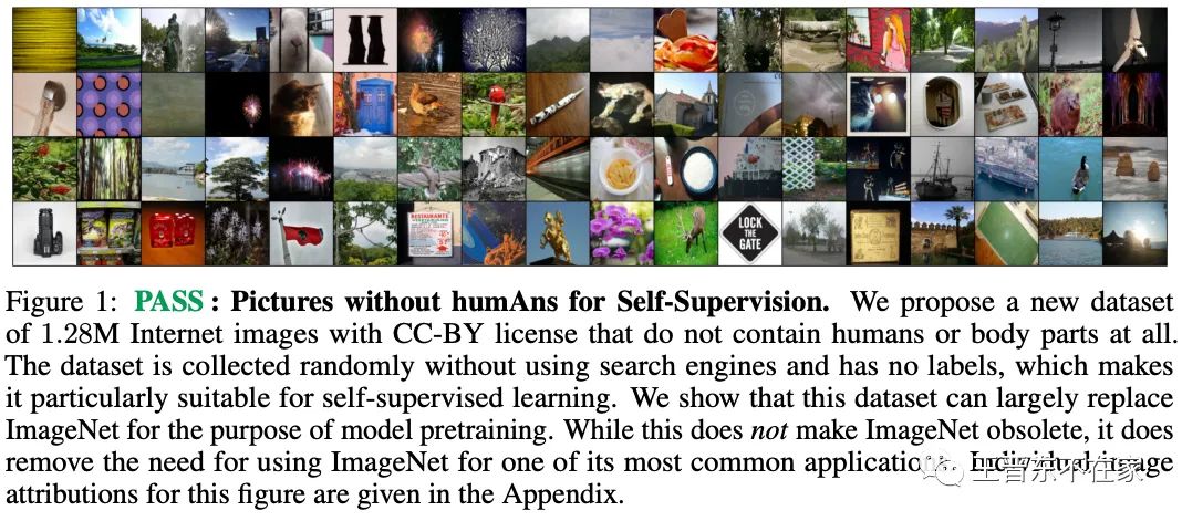 PASS数据集全称Pictures without humAns for Self-Supervision,来自大名鼎鼎的牛津大学VGG组。此数据是一个完全无标注的数据集,包含128万张图像。提出此数据集的原因是考虑于ImageNet的版权和隐私问题,并不是很好用。它的特点是不包括任何人和身体部位,因此排除了版权问题。此数据集用于进行自监督训练,论文中也评价了多种在此数据集上预训练的模型迁移到其他下游任务上的表现。