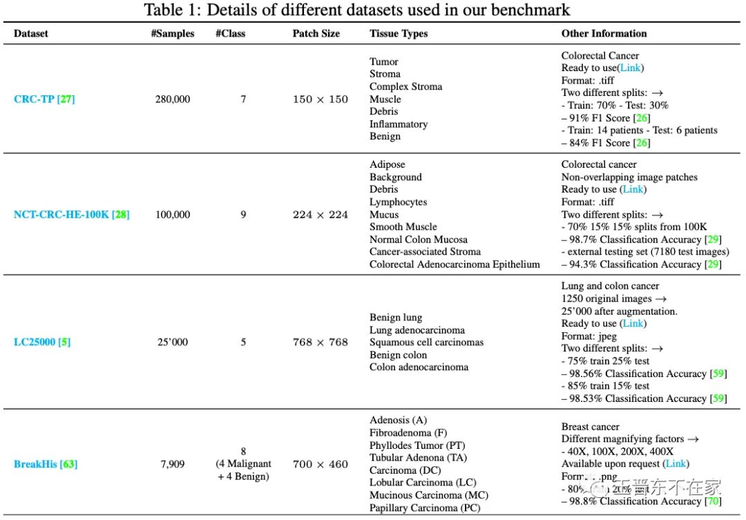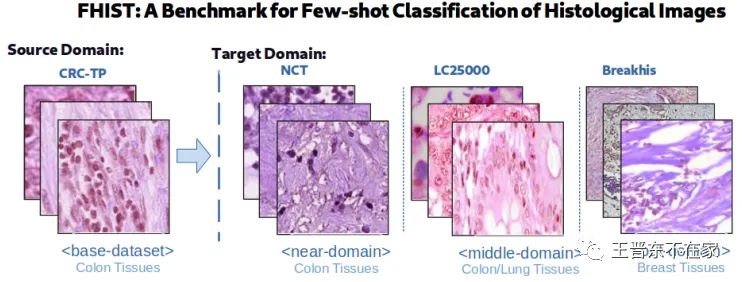 FHIST是一个由多个公开数据集组成的医学数据集,其主要是分类任务,由CRC-TP、NCT-CRC-He-100K、LC25000、BreakHis这四个公开数据集构成,其中每个公开数据集可以当做一个domain(但它们的类别彼此不同)。论文建议由数量最多的CRC-TP当做source domain,其他三个按照与其相关程度分别当做3个target domain来测试元学习和迁移学习算法,如下图所示: