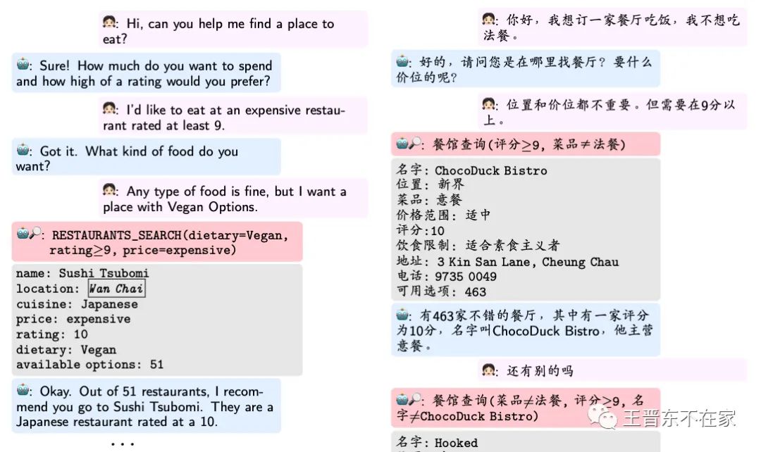 BiToD是由香港科技大学开放的一个中英文双语对话数据集,包含了Restaurant、Attraction、Metro、Weather、Hotel这5个domain,因此可以进行多领域的迁移。除此之外,该数据集也可以进行跨语言的迁移学习。下图展示了中文和英文两个语言的对话截图。