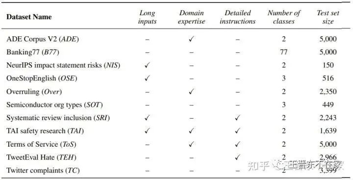 RAFT(Real-world Annotated Few-shot Tasks)用来评估大规模小样本的文本分类。其包含了众多数据集的任务:ADE、Banking77等。作者构建了一个统一的评测标准来进行跨任务、小样本的文本分类评测。