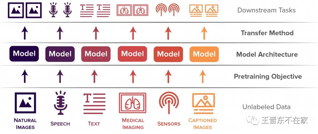 DABS是由斯坦福大学从多个数据集中收集整理的,其被用于进行领域无关(Domain-agnostic)的自监督学习。其包括6个模态的数据:自然图像、语音、文本、医学图像、传感器、带有标注的图片。该数据集要求开发的新算法必须在所有的模态上进行自监督训练,然后迁移到属于这些领域的若干个下游任务,以此来评价方法对于领域无关的数据的有效性。如下图所示。