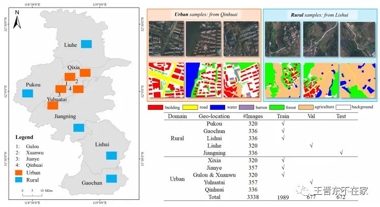 LoveDA (名字挺好)是由武汉大学开放的一个用于评价领域自适应 (Domain adaptation)算法在遥感图像上进行语义分割的数据集。它包含了7个类别、3338张图像,由来自城市和郊区的图像组成,它包含了86516个图像标注。如下图所示。