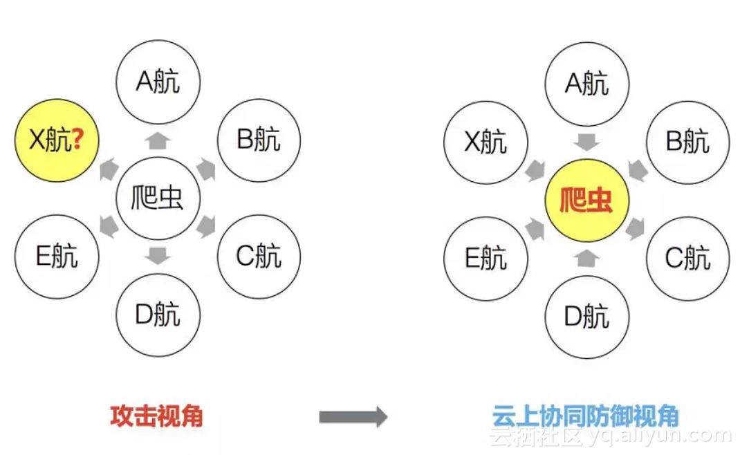 以航空行业为例,机票向来是爬虫重点关注的对象,从爬虫的角度来看,一个黄牛或旅行社背后的爬虫往往会光顾各大航司以获取最全的票价信息,所以当我们检测到一个爬虫光顾了ABCDE航司后,你说他爬X航的概率大吗?当然。 这个不是假设,而是我们已经在实际的流量中发现的行为。于是我们由此拓展开来,基于一定的模型生成在多家航司网站上有过可疑行为的,实时的(注意是实时的哦)爬虫库,这就是典型的云上协同防御模型。这样对于新接入的X航来说,我们甚至可以用情报的思路把防护做到事前。