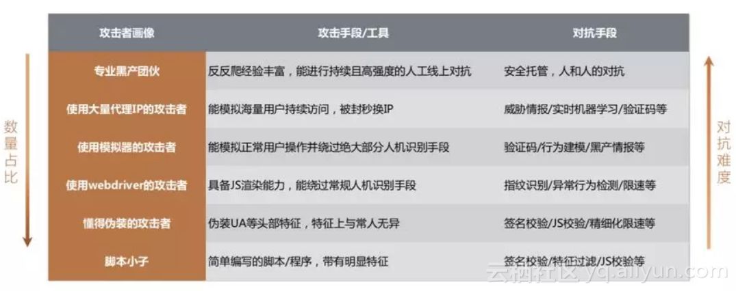 这个问题要辩证来看,从阿里云安全团队线上对抗的经验来看,答案完全取决于你在跟什么水平的爬虫对抗,我们姑且拍脑袋把互联网上的爬虫流量来源划为下面这几类: