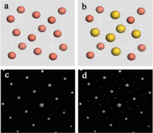 上图即是 CuAu3无序和有序的模型和对应的电子衍射花样。其中图 a 是 CuAu3无序时的晶体结构模型,而图 b 是有序时的晶体结构模型;图 c 是与无序对应的电子衍射花样,而图 d 则是与有序对应的超点阵电子衍射花样。