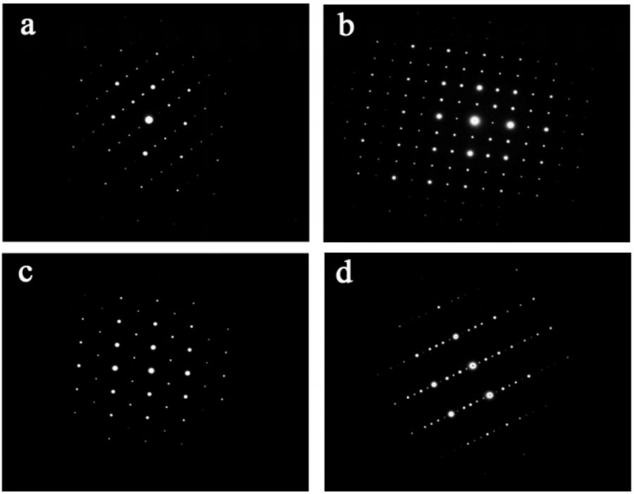 上图是超点阵花样的一些实例, 这些花样是从一种沿[111] 方向具有六倍周期的复杂有序钙钛矿相中得到的。 图 a 是沿[010] 方向 2 倍周期有序的超点阵电子衍射花样, 图 b 是沿[101] 方向 2 倍周期有序的超点阵电子衍射花样,图 c 是沿[11-1]方向 2 倍周期有序的超点阵电子衍射花样,而图 d 则是沿[111] 方向 6 倍周期有序的电子衍射花样。
