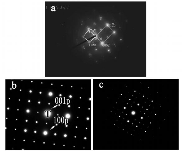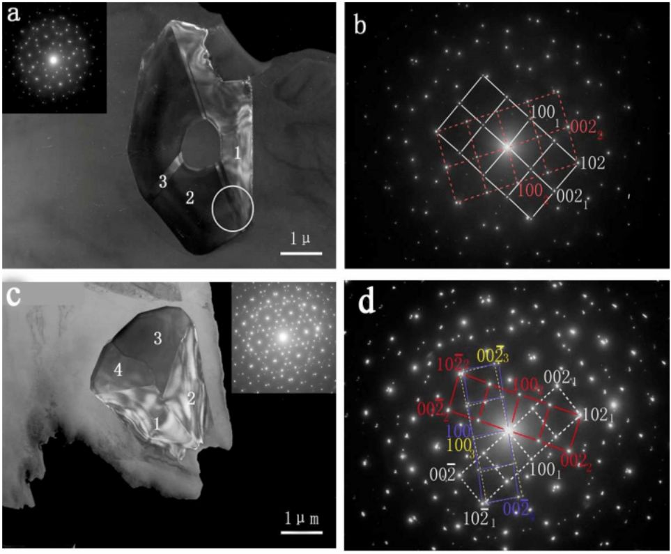 上图是 CaMgSi相中(102)孪晶中二重孪晶和三重孪晶的形貌和与其对应的电子衍射花样。图 a 是二重孪晶的形貌(暗场像),图 b 是与之对应的二重孪晶花样;图 c 是三重孪晶的形貌像(暗场),图 d 是与之对应的三重孪晶花样。