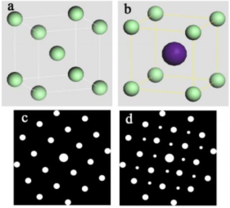 上图是 CsCl 无序和有序的模型和对应的电子衍射花样。其中图 a 是 CsCl 无序时的晶体结构模型,而图 b 是有序时的晶体结构模型; 图 c 是与无序对应的电子衍射花样示意图,而图 d 则是与有序对应的超点阵电子衍射花样示意图。