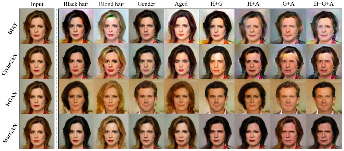 如上图所示,在所有参与实验的模型中,StarGAN训练的模型生成的图片最为清晰自然,它很好地保留了人脸的基础形象和面部特征。虽然DIAT、CycleGAN模型也保留了大部分脸部特点,但它们生成的图像都十分模糊。而IcGAN甚至无法保留原图像的基础信息,生成了一些男性图像。